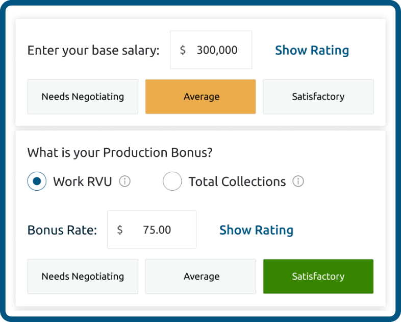 Enter numbers like your salary, production bonus, signing bonus, paid time off, and more to see whether they are below average or on par with other physicians like yourself.