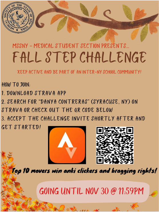 The Medical Student Section of MSSNY is hosting a “Fall Step Challenge.” Participants can download the Strava app and join the challenge by searching for “Danya Contreras” in Syracuse, NY. The competition runs until November 30th, 11:59 pm. The top 10 participants will be awarded Anki clickers and earn bragging rights within the community. Don’t miss this opportunity to stay active and connect with peers!